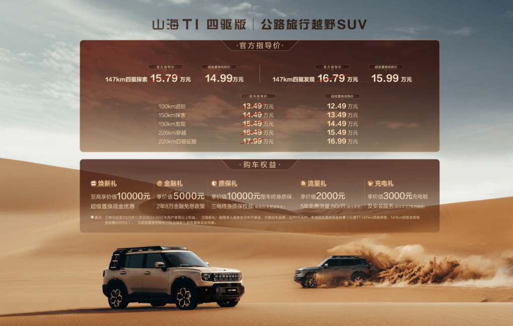 147km四驱探究版、147km四驱发现版正式上市,价格分别为15.79万和16.79万元,置换价14.99万-15.99万元。